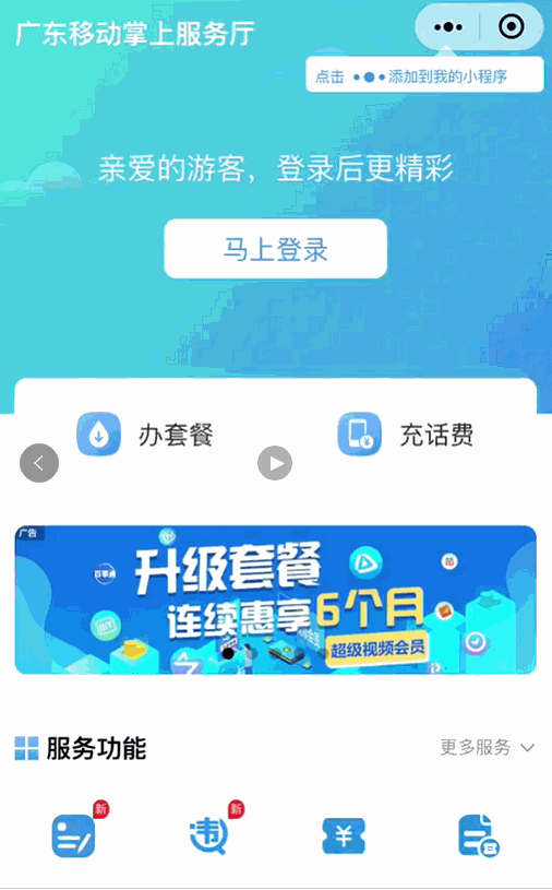 拿缴话费的小程序为例,在附近小程序里面,找到小程序,用户可直接到门店办理业务,也可点击「缴费」,使用小程序付款。